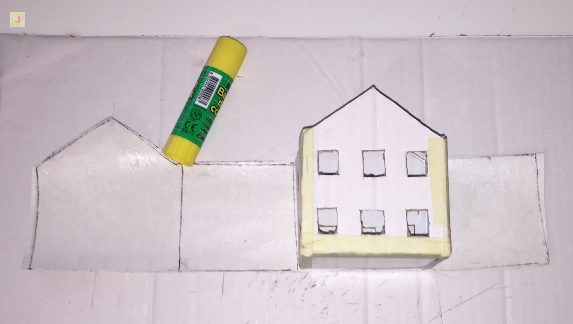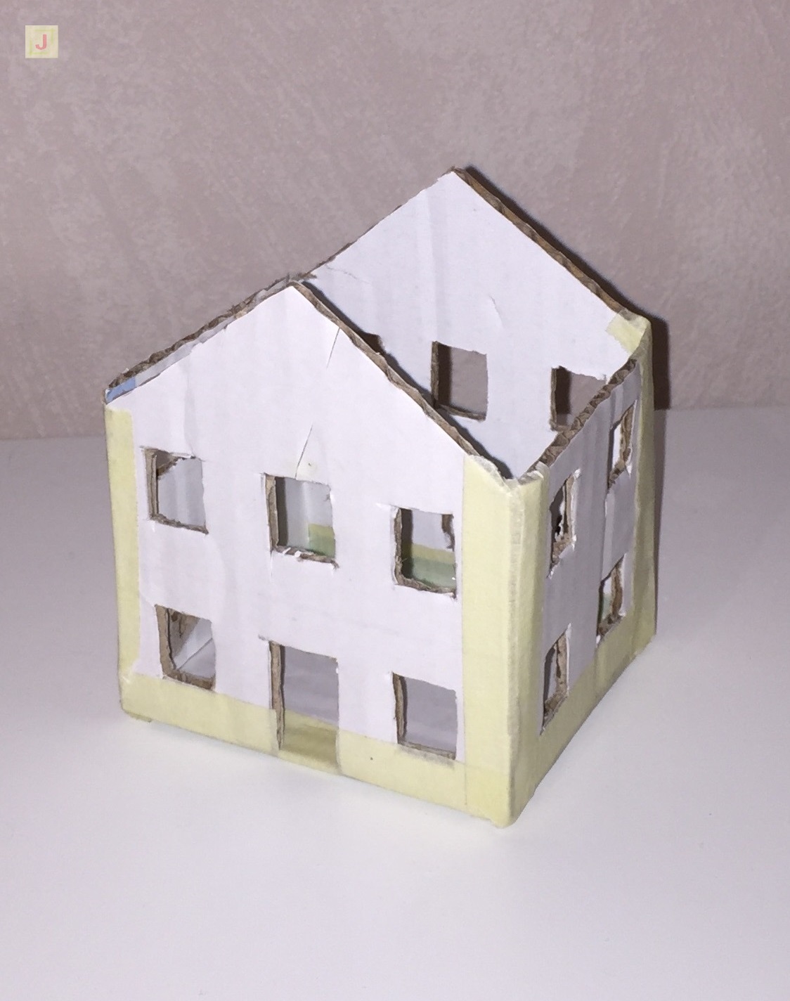 Als Nächstes wird das kleine Haus zusammen gebaut. Dafür habe ich Kreppband benutzt, da das Haus später noch mit Tapete beklebt wird, wird man vom Kreppband nichts mehr sehen.