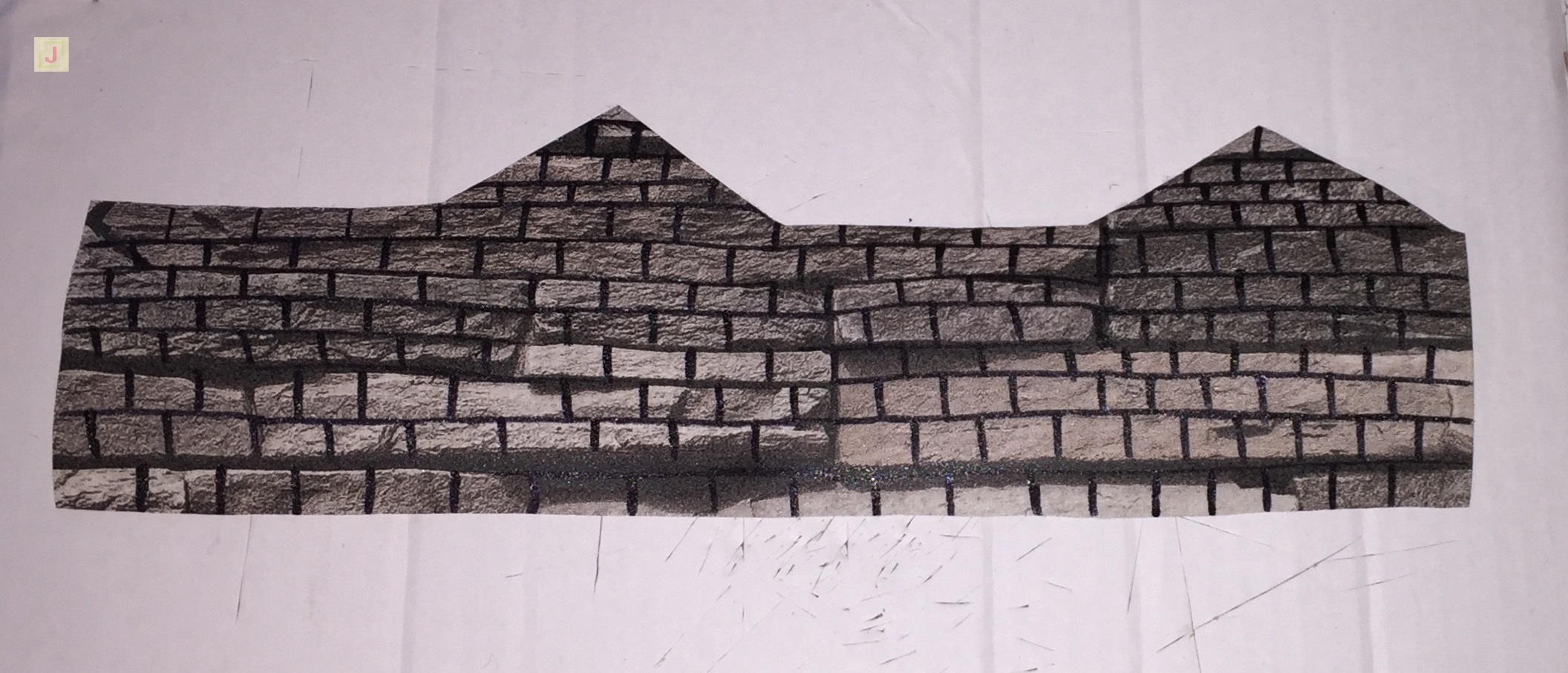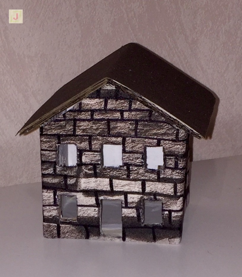 Um mein kleines Papp-Haus zu verkleiden habe ich ein Stück „Steinoptik“ Tapete benutzt, das ich noch übrig hatte. Da die Steinreihen auf der Tapete für mein Haus sehr groß waren, habe ich mit einem schwarzen Filzstift noch einige Reihen dazu gemalt und dann das Häuschen mit der Tapete beklebt.