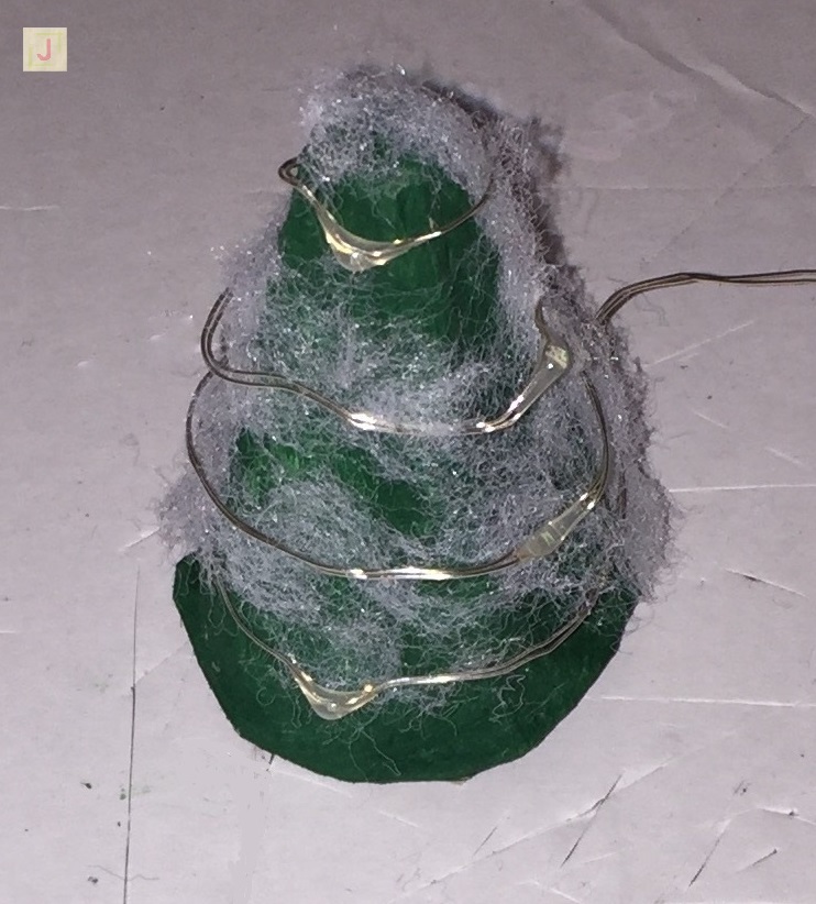 Für meinen Tannenbaum habe ich ein Stück aus dem Eierkarton geschnitten und es grün bemalt. Anschließend einfach mit etwas Watte (oder Kunstschnee) und einer batteriebetriebenen Mikro Lichterkette umwickelt