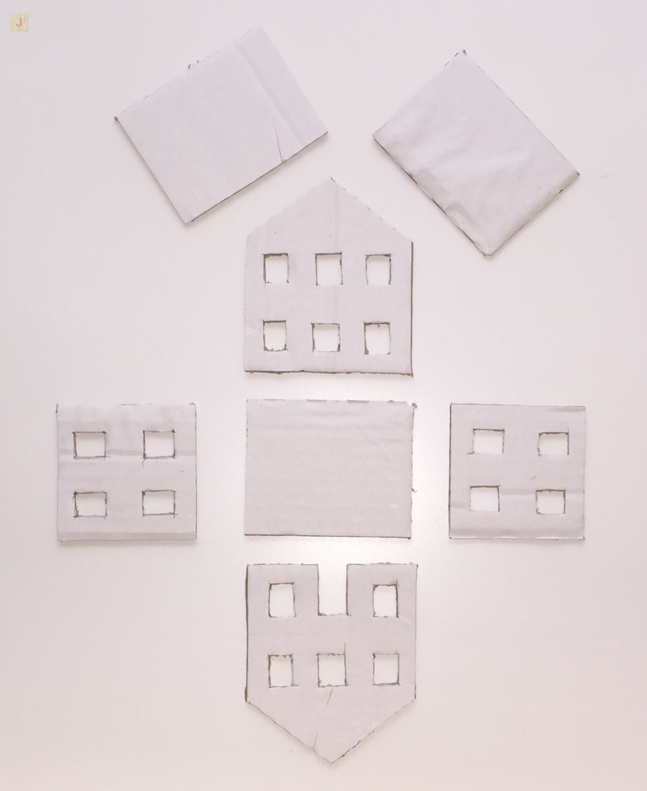 Für das Häuschen musst du als Erstes alle Teile auf Pappe zeichnen und ausschneiden. Es besteht aus 2 Giebelwänden, 2 Seitenwänden, einem Bodenteil und 2 Dachhälften. Dann habe ich noch Fenster und eine Haustür ausgeschnitten.