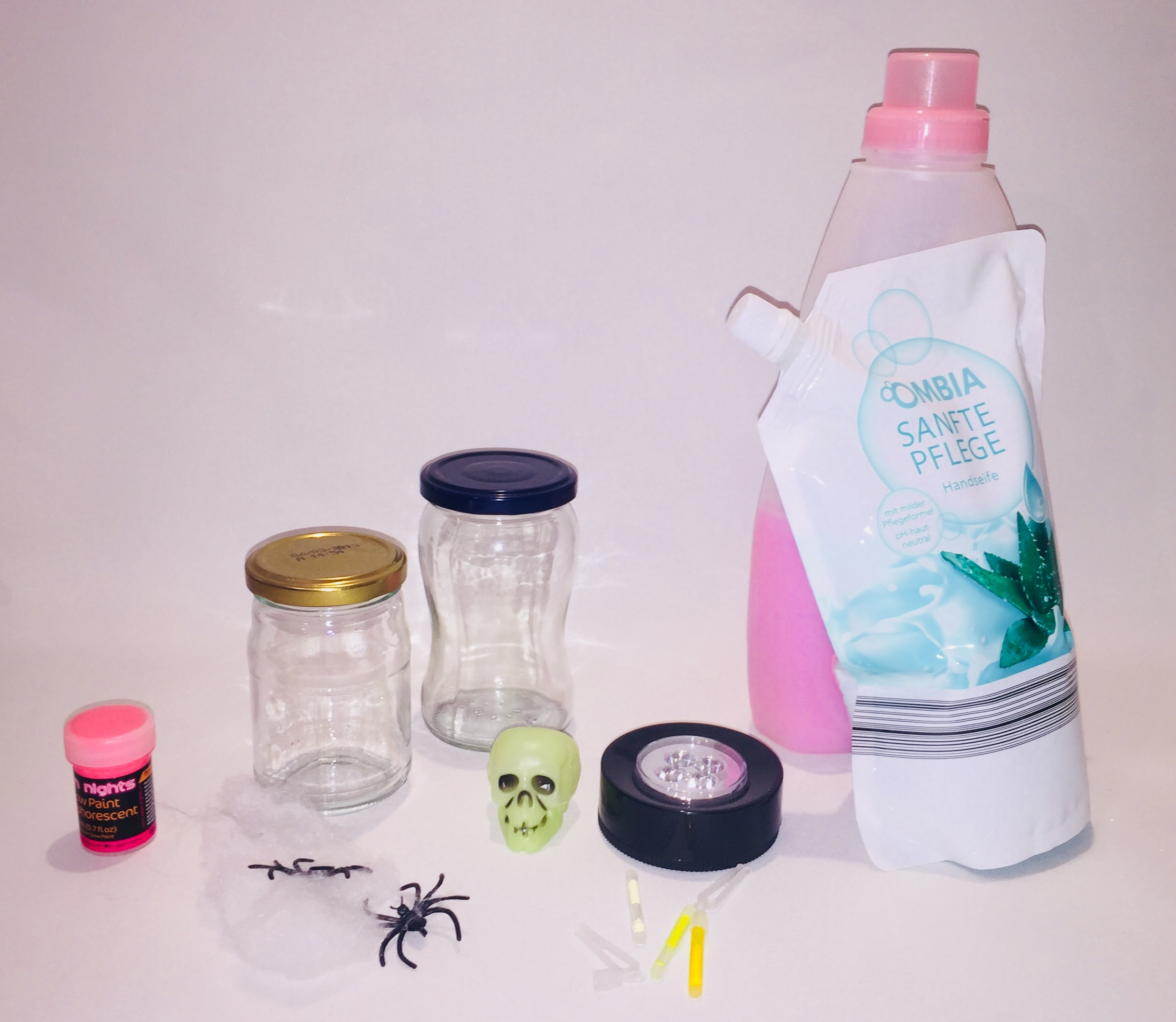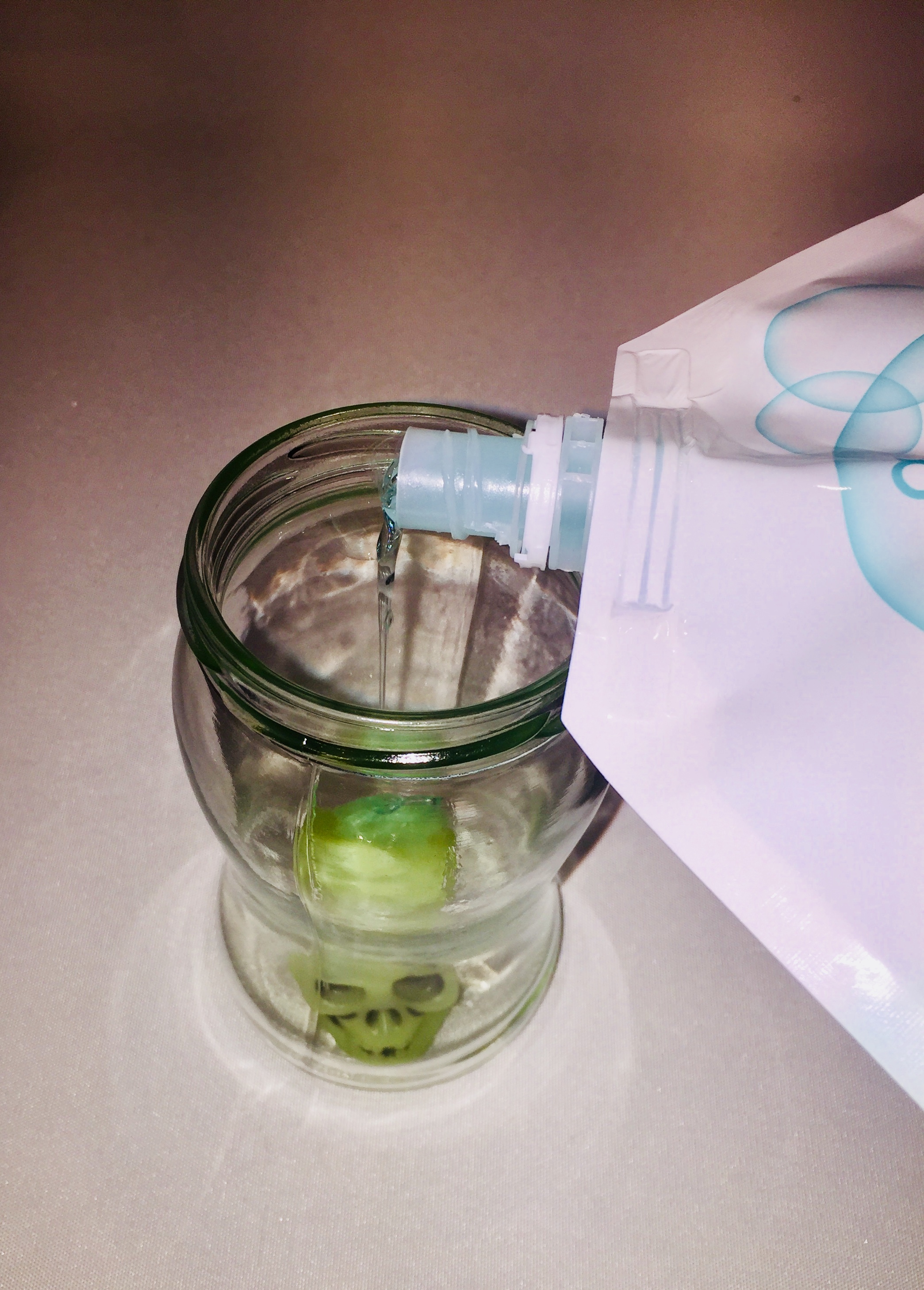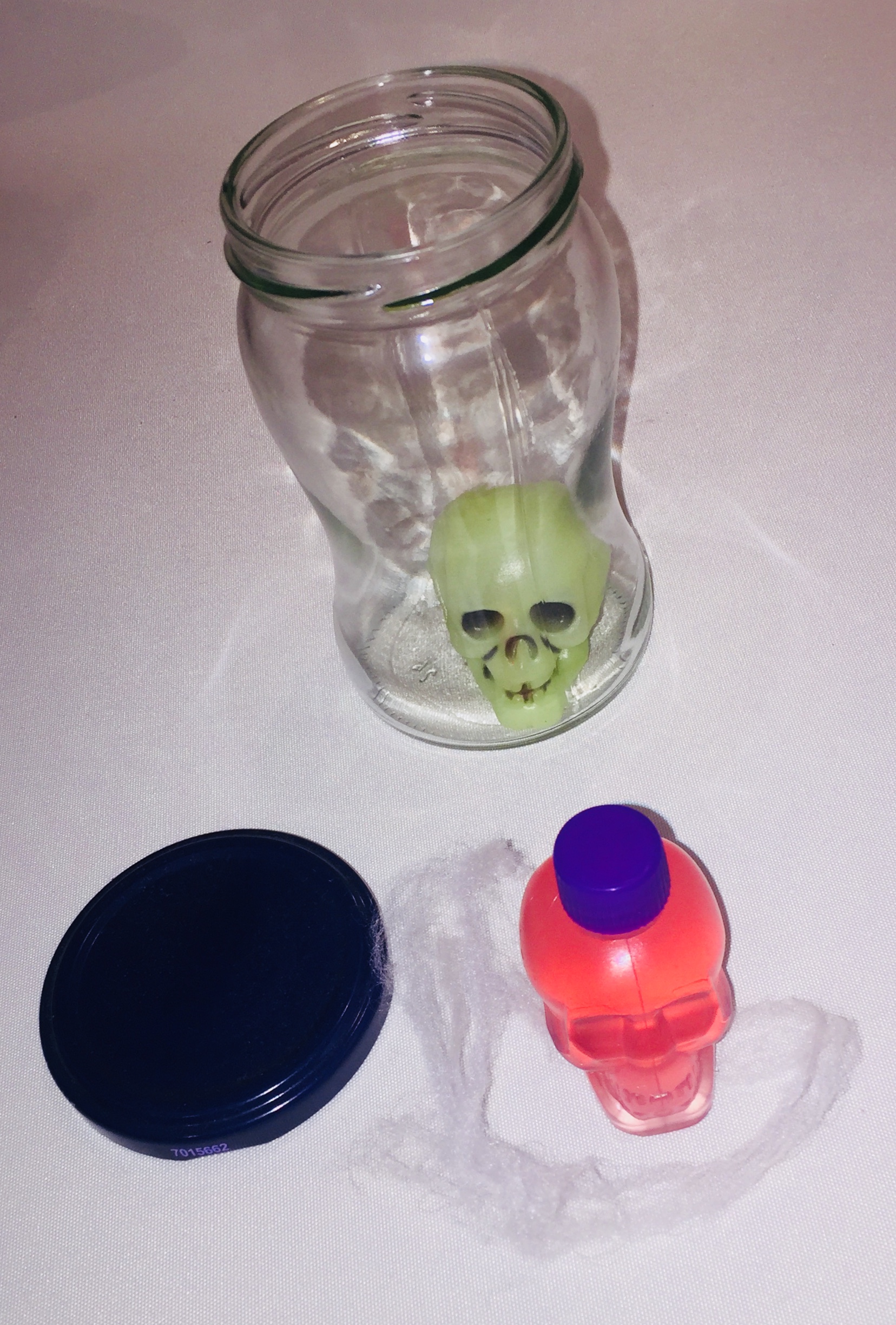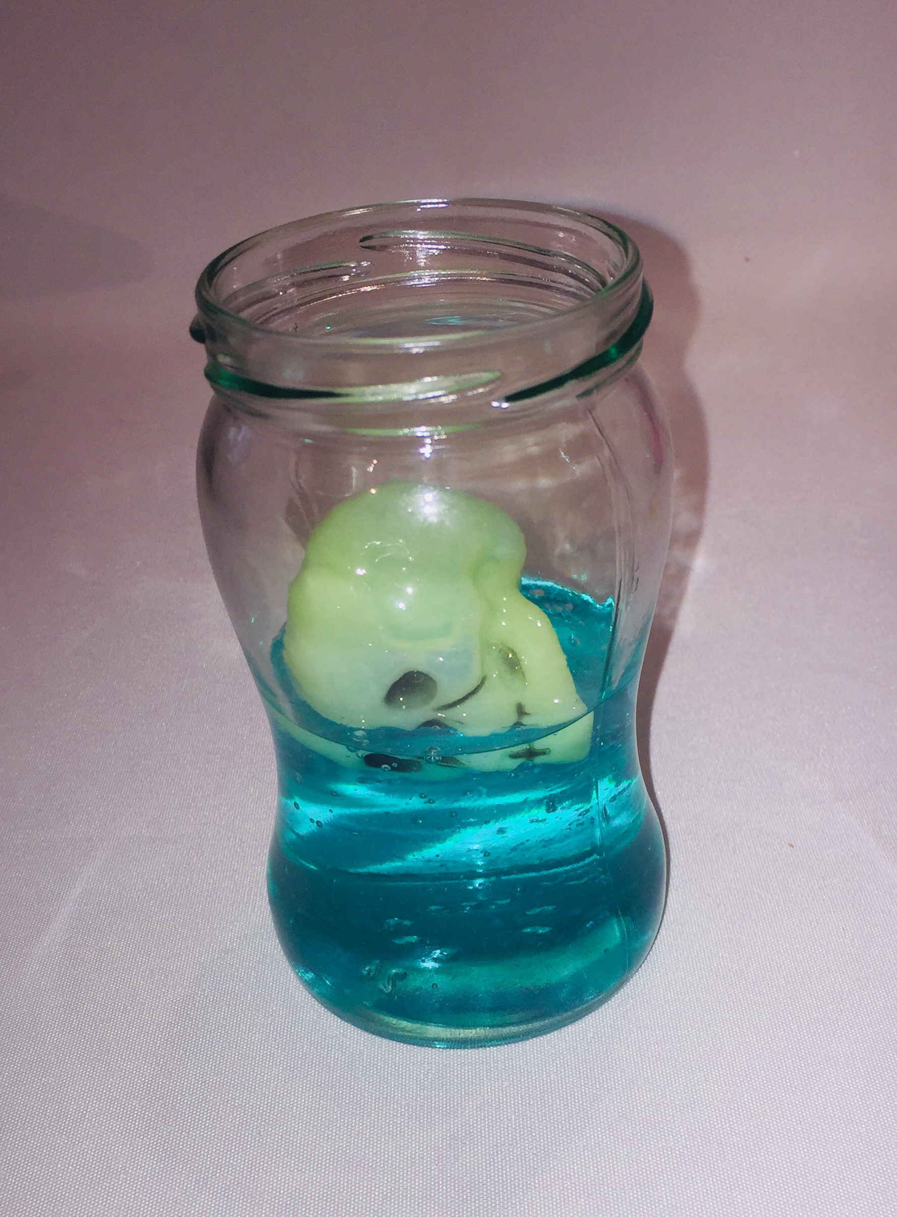 For my spooky DIY Halloween light I used a glow in the dark skull and put it on the bottom of the mason jar and poured the clear soap over it. After the jar was almost completely filled with the soap I put the second skull on top.