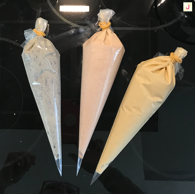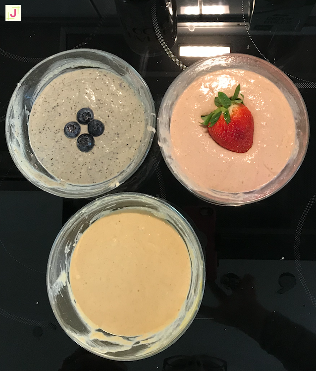 Dann habe ich den fertigen Teig auf 3 Schüssel verteilt und jeweils mit dem Apfel-Mangomus aus dem Glas, selbstgemachtem Blaubeer- und Erdbeermus vermischt und dann in Spritzbeutel gefüllt.