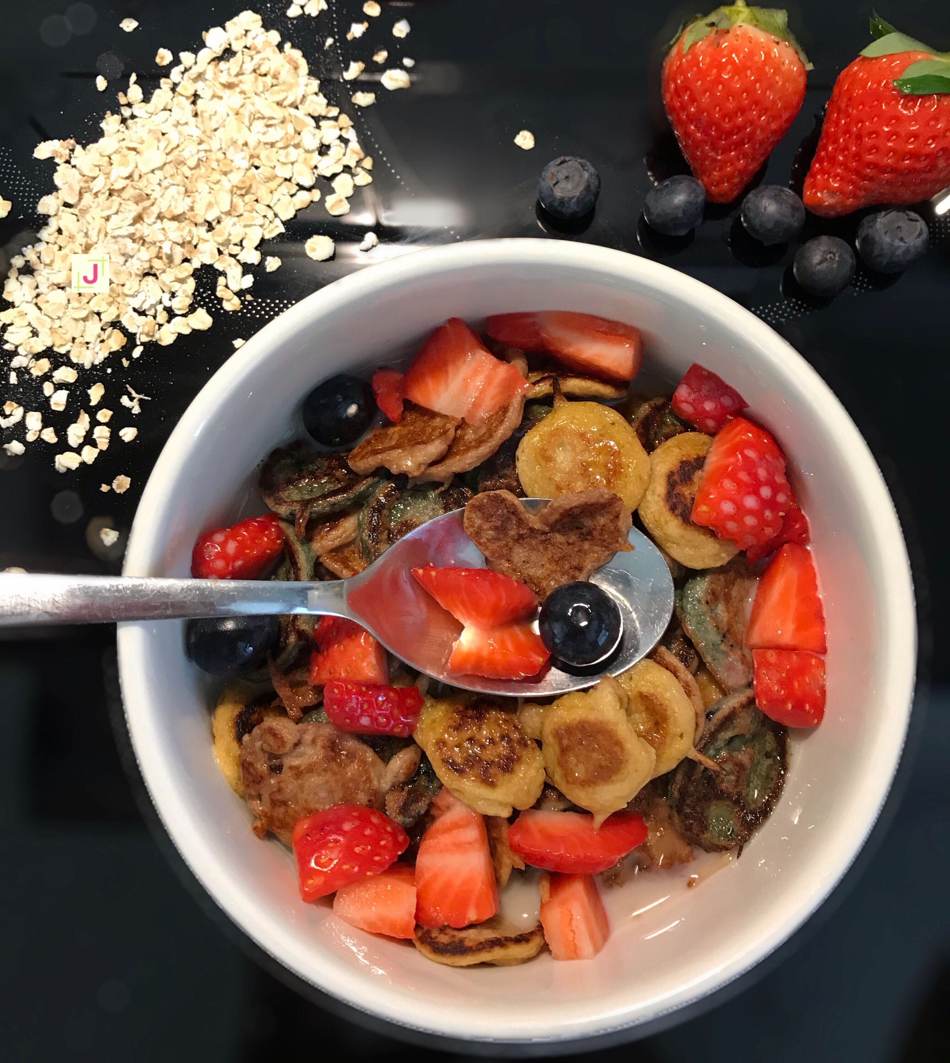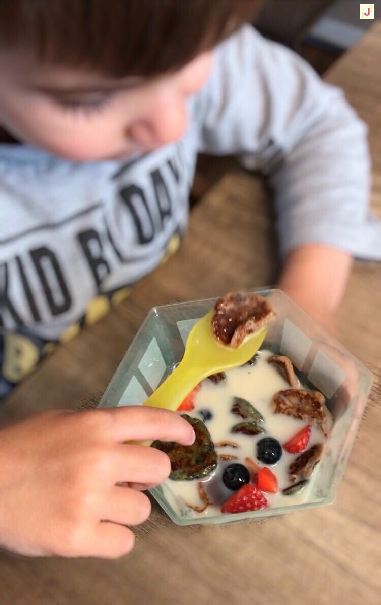 Das sind Mini Pfannkuchen, die wie Müsli oder Frühstücksflocken in einer Schüssel mit Milch (und etwas Sirup) gegessen werden.