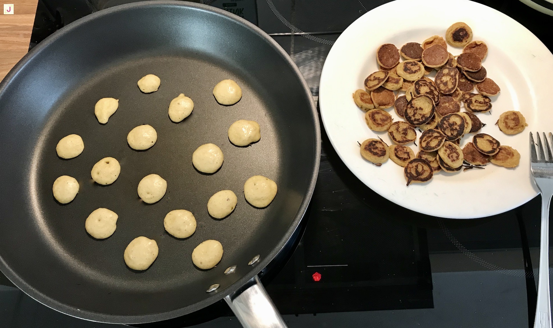 So jetzt geht’s endlich an die Mini Pfannkuchen Zubereitung. Dazu einfach die Spitze des Spritzbeutels abschneiden und kleine Pfannkuchen in der Pfanne platzieren und mit einer Gabel wenden.