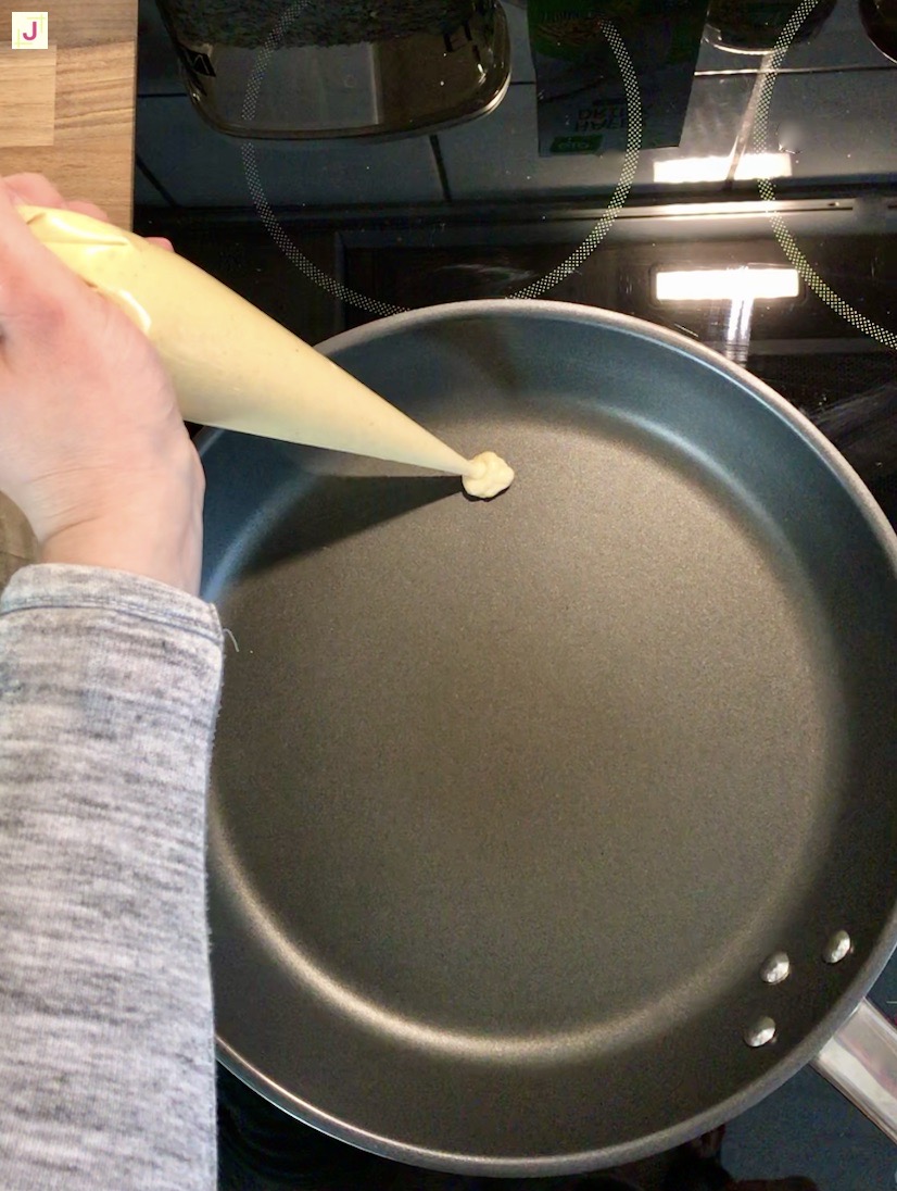 - Dann den Teig in einen Spritzbeutel oder eine Quetschflasche füllen und als Mini Pfannkuchen in der Pfanne geben. Dann von beiden Seiten goldbraun backen.