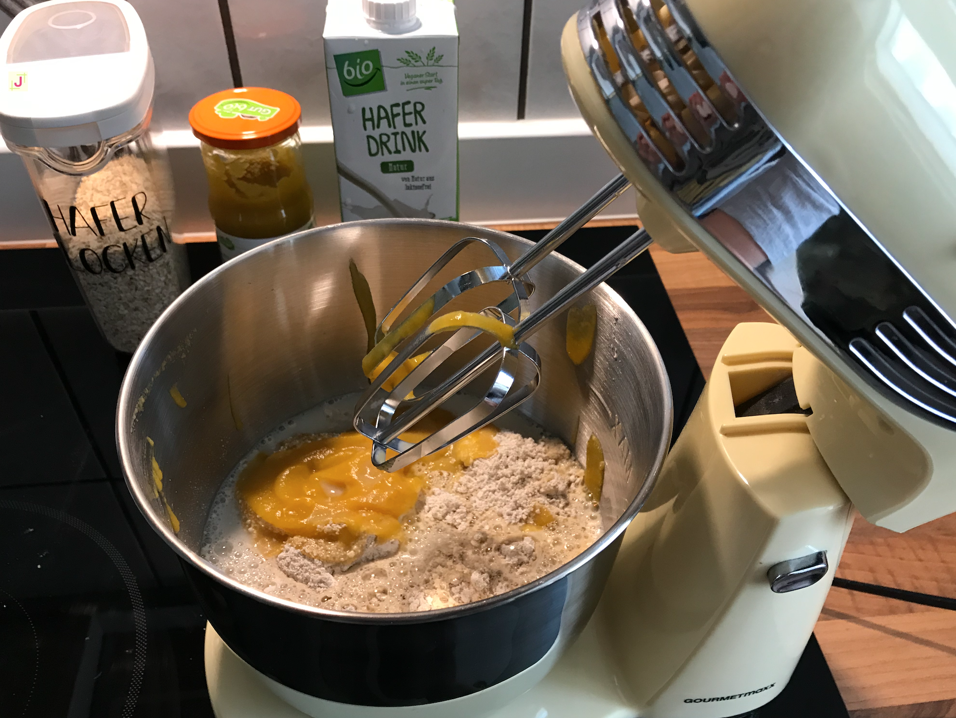 Für dieses Rezept habe ich mich für die Vegane Variante entschieden, da ich Haferflocken liebe. Dazu habe ich einfach frisches Haferflockenmehl hergestellt mit meinem Mixer. Außerdem hatte ich keine Eier mehr im Haus, also wurde stattdessen einfach Apfelmus (Mango-Apfelmus) benutzt.