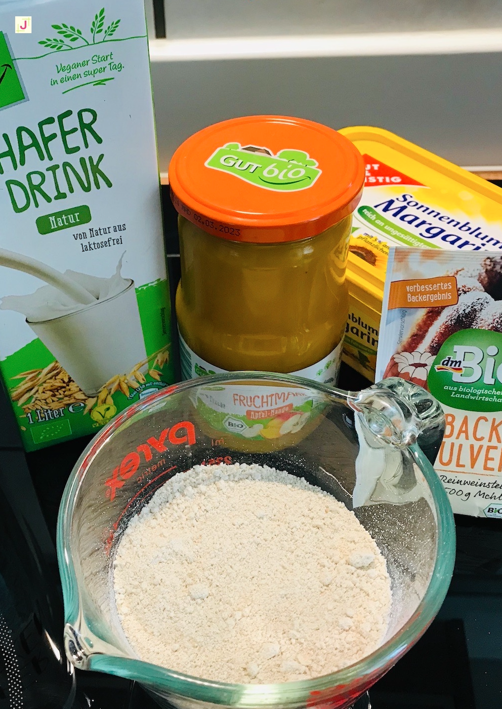 - 4 EL Apfelmus (ich habe Apfel/Mangomus verwendet) oder 1 Ei