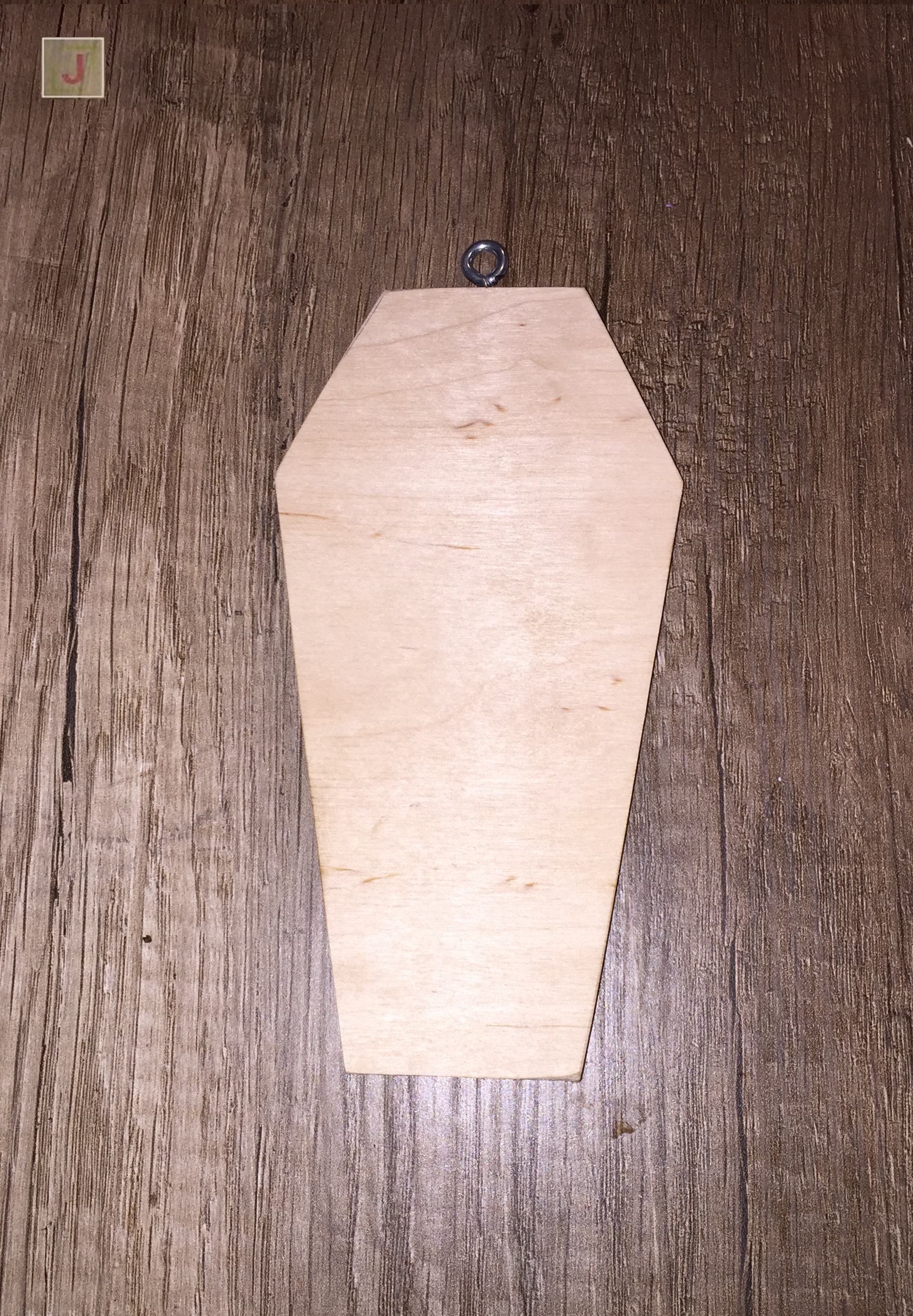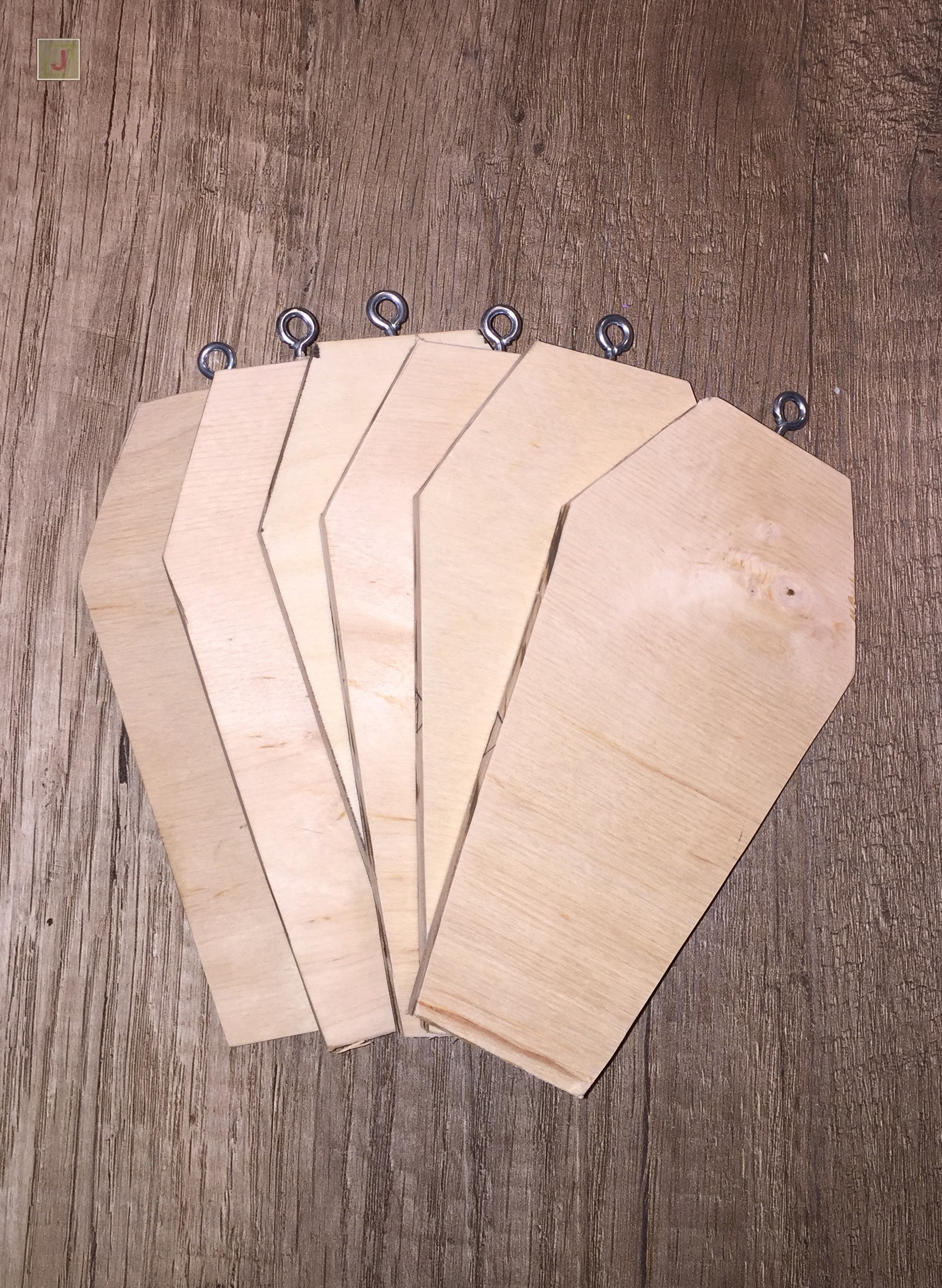 Als erstes werden die Särge auf die Sperrholzplatte aufgezeichnet und dann ausgesägt. Dann werden die Ösenschrauben oben in die Särge gedreht. Danach kann man einen Faden oder ein Seil durch die Ösen fädeln und die Särge nach Lust und Laune bemalen und gestalten.
