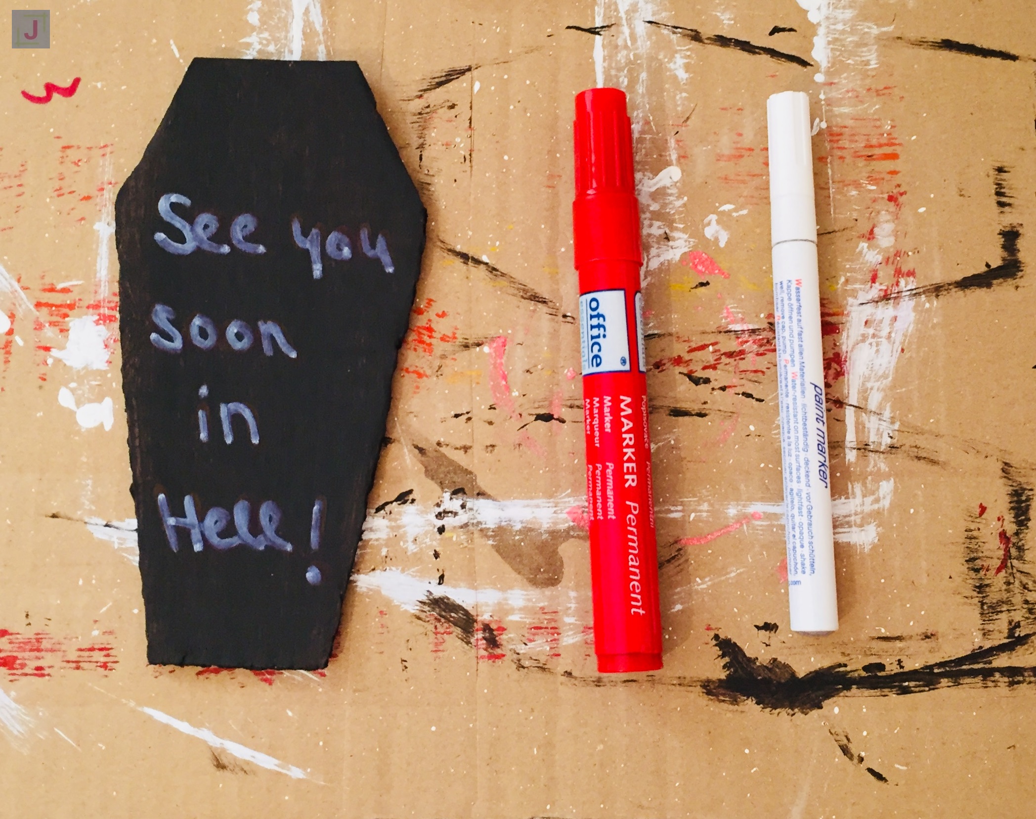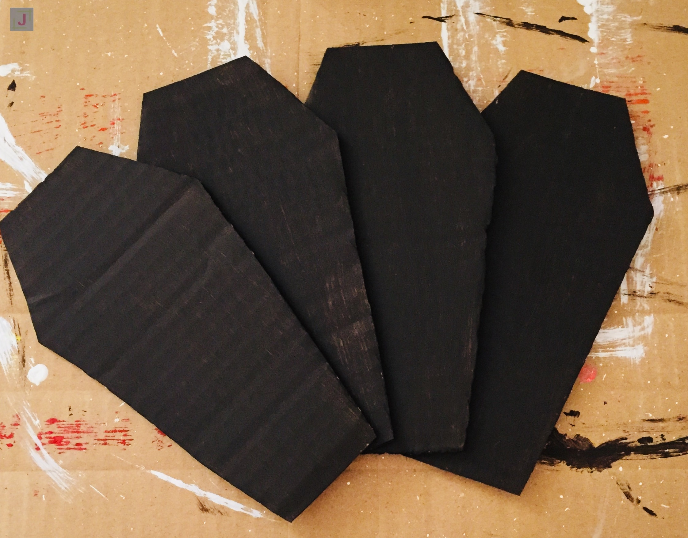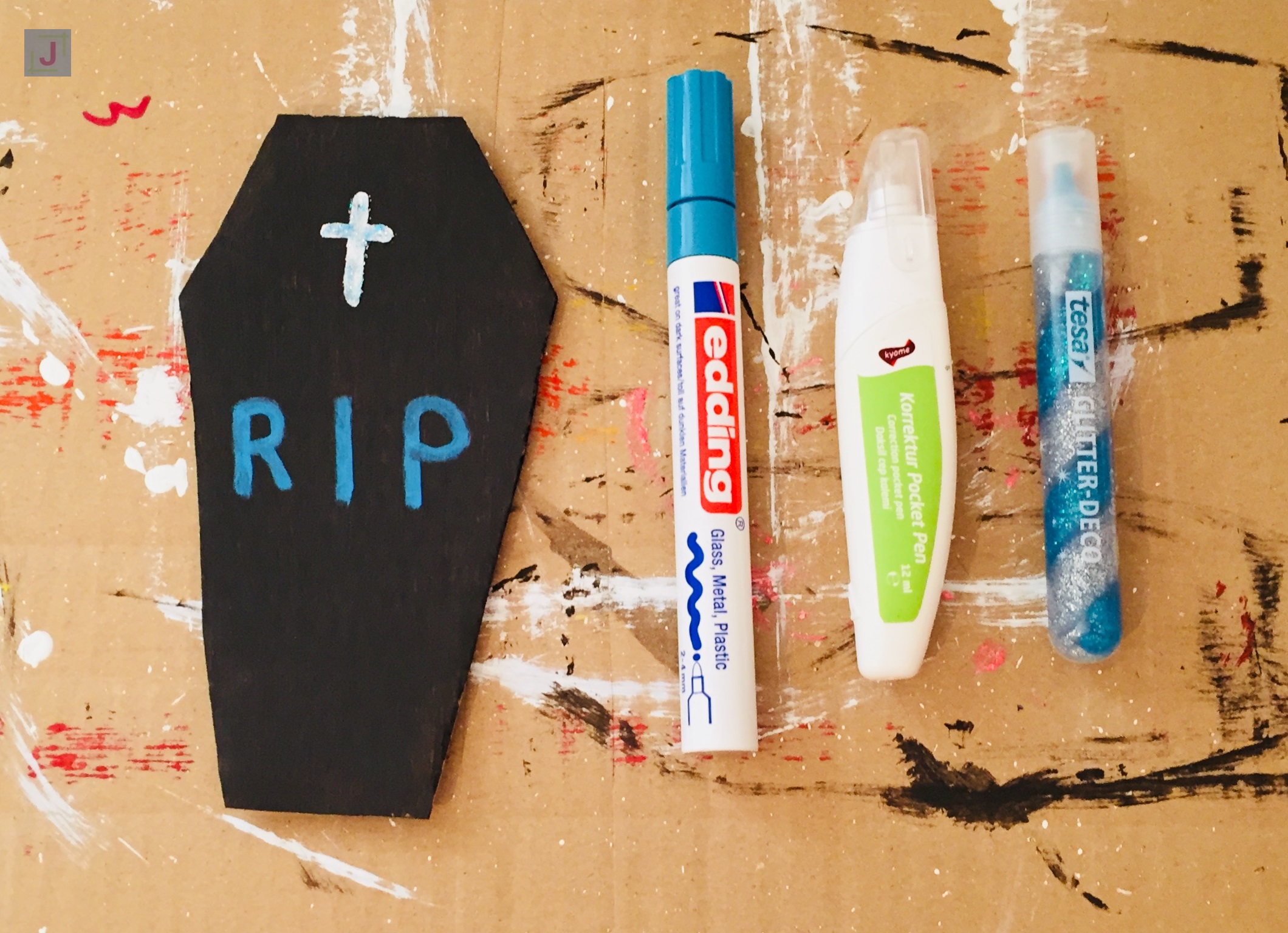 Du kannst die Särge natürlich auch aus Pappe basteln. Dazu werden 2 Särge aus Pappe mit einer Schere oder Cuttermesser ausgeschnitten. Danach in den gewünschten Farben bemalen und beschriften.