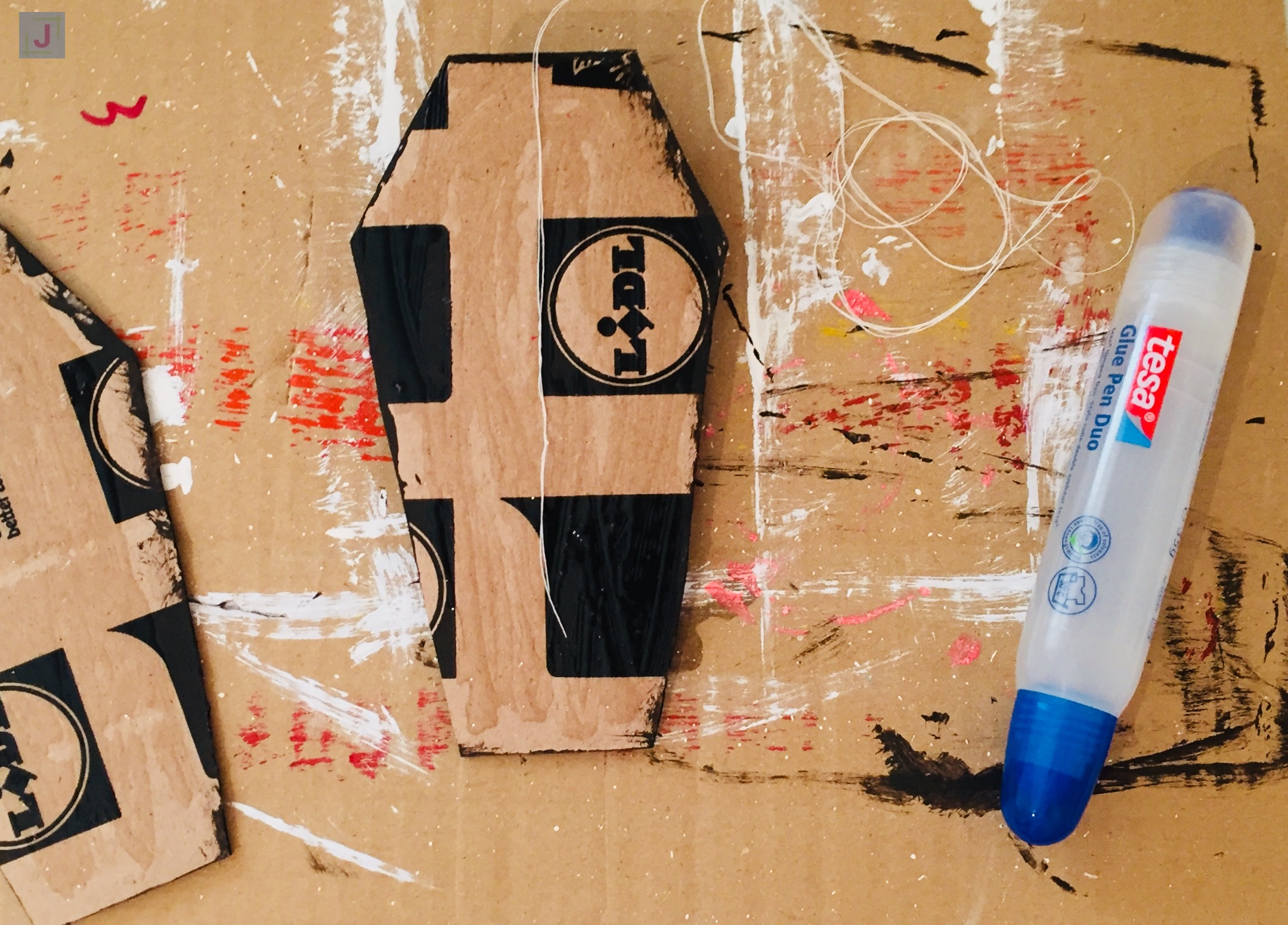 Wenn alles getrocknet ist, einfach die beiden Rückseiten mit Kleber bestreichen, einen Faden oder Seil auf eine Seite legen und beide Sarg-Rückseiten zusammen kleben.